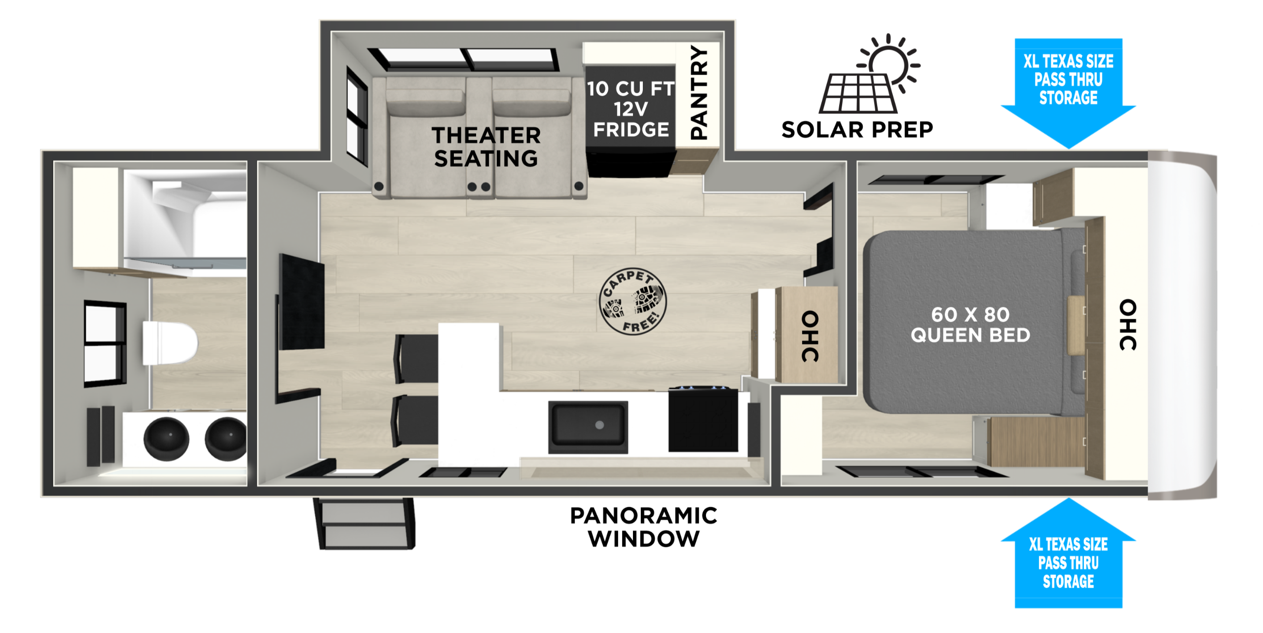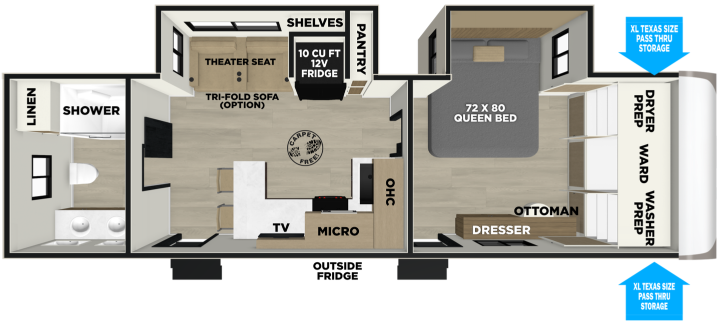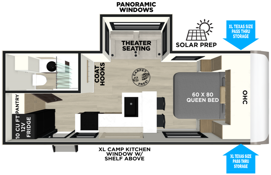 The 275RL offers you not 1, but 2 MASSIVE windows facing your campsite. They're complimented by a panoramic picture window situated on the rear wall. Enjoy a pantry big enough for that extra long camping trip you've been dreaming of. The impressive storage follows through to your bedroom.