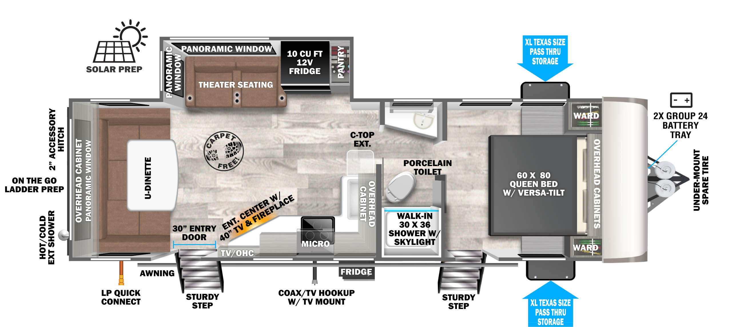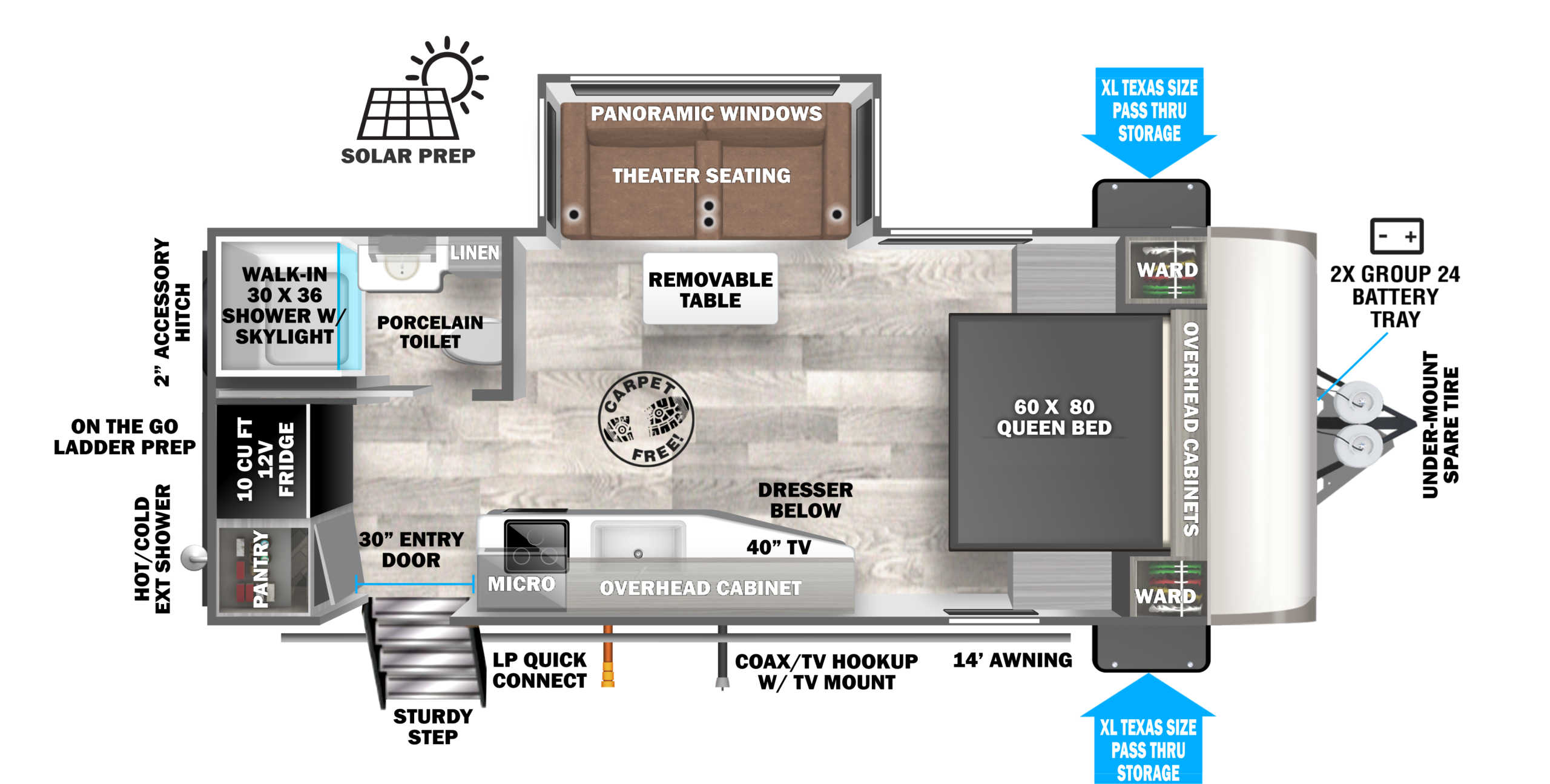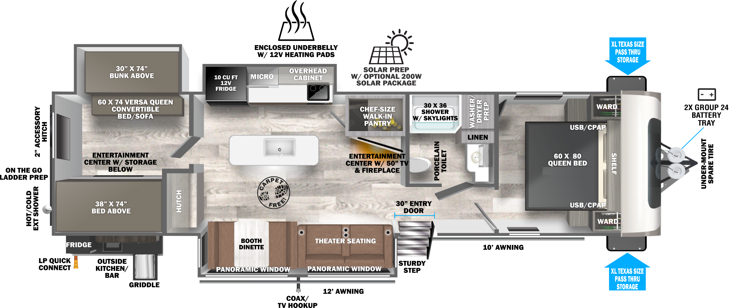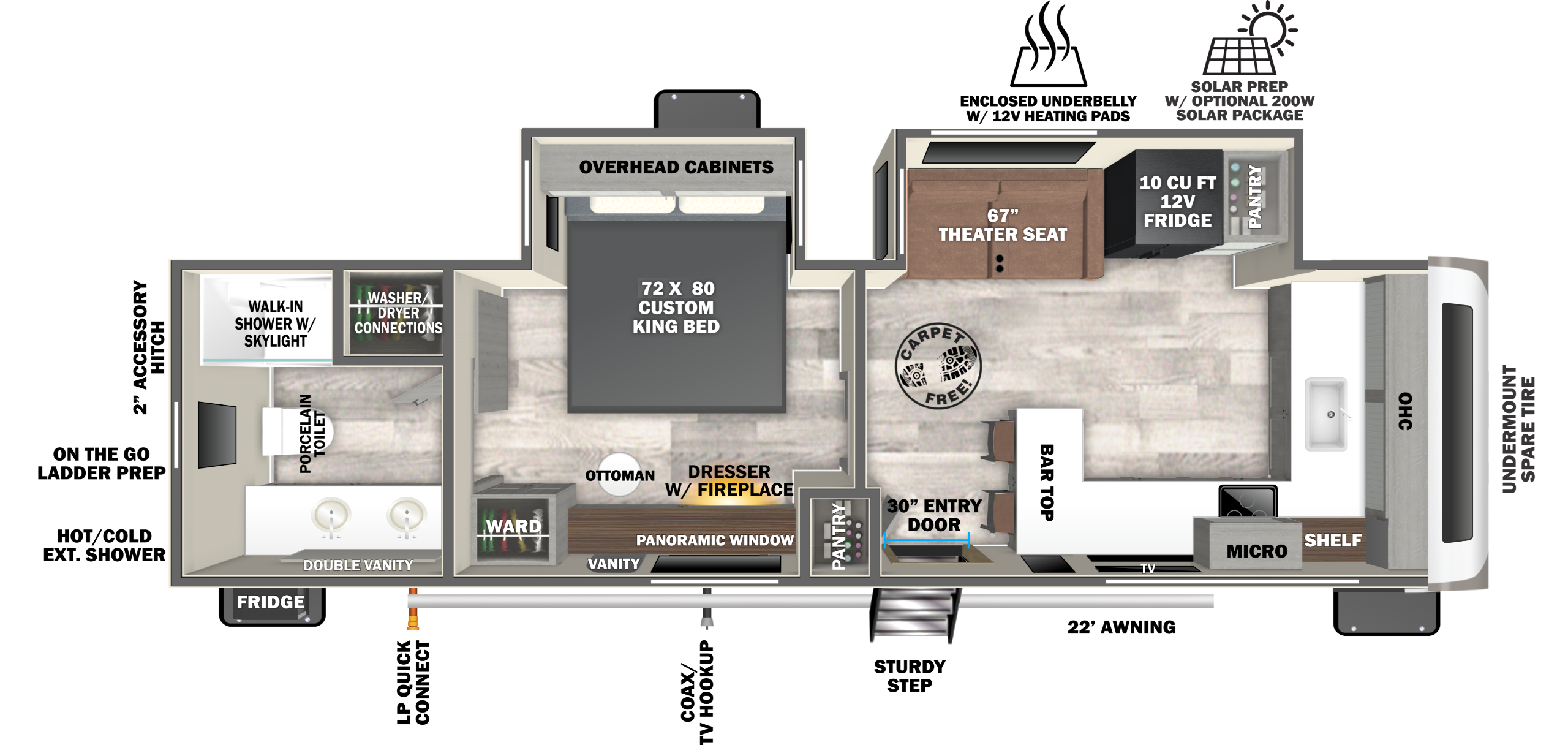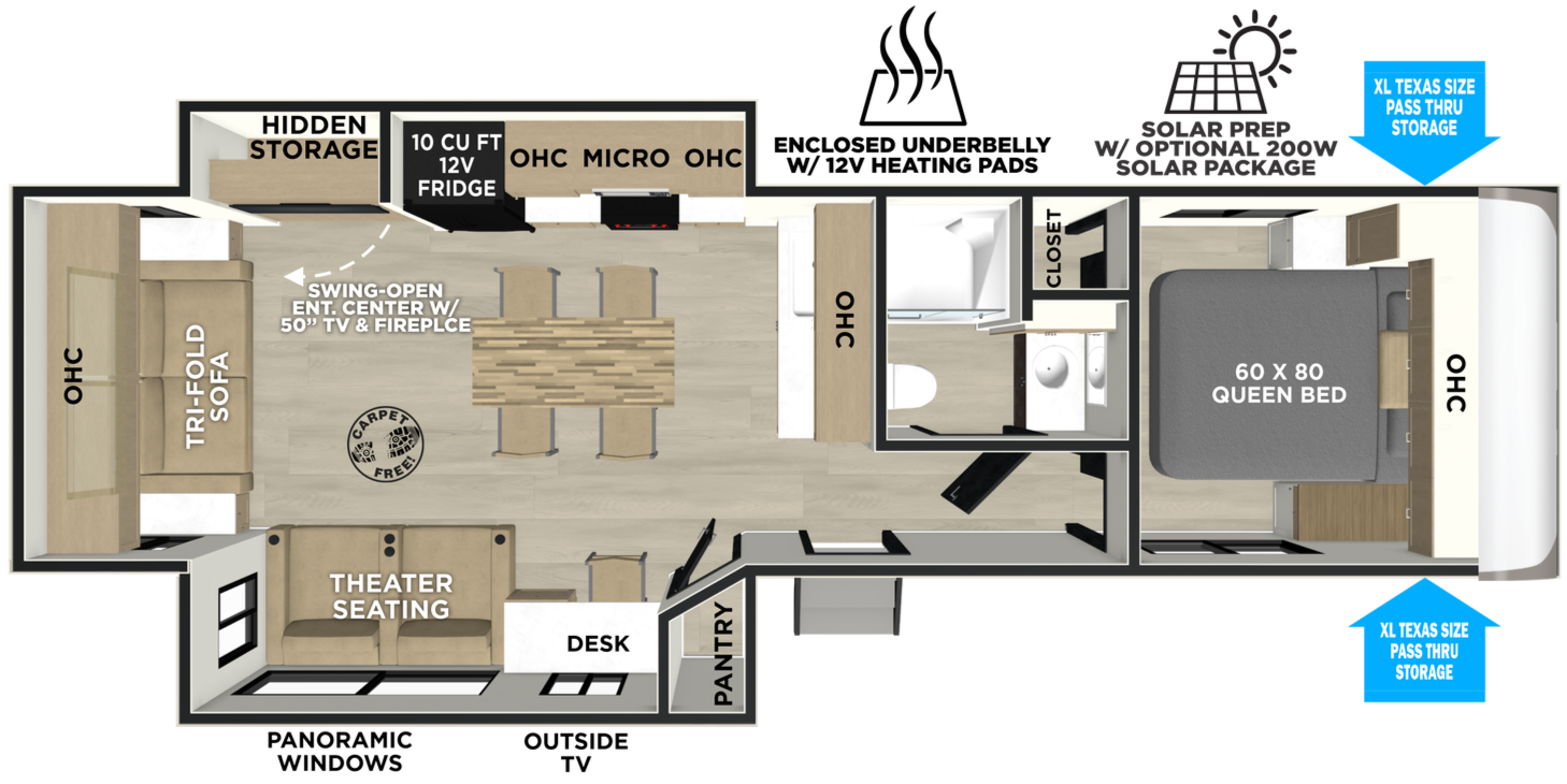 A truly private bedroom, and enormous bathroom make the 22RBHL a crowd favorite. Direct-Viewing of entertainment center, and a massive pantry are one of many great features on this floorplan.