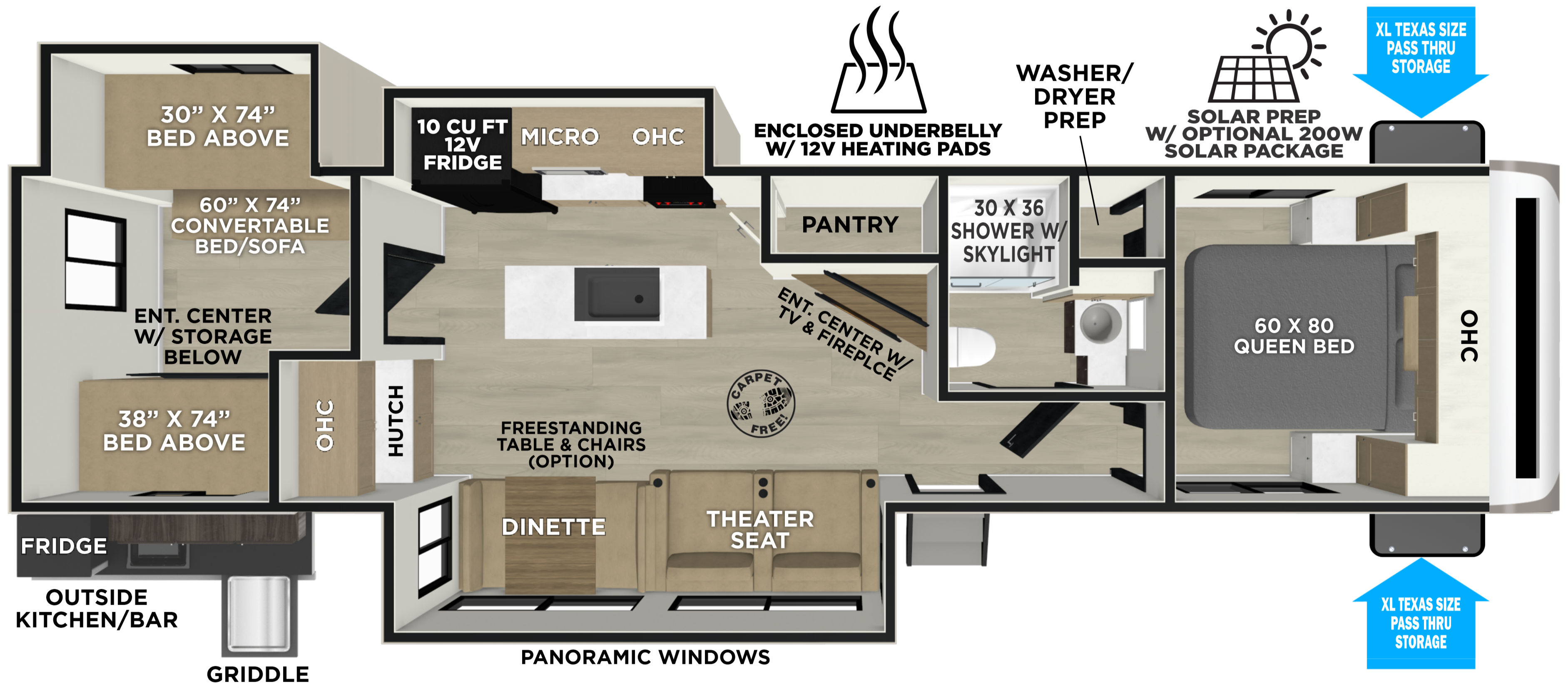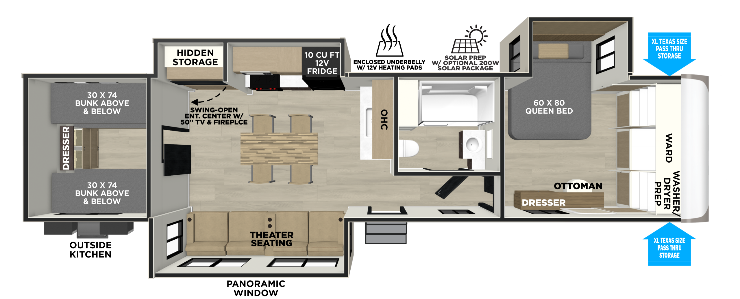 The 301FAM features a private quad bunk room with seating for all in the living room. The furniture is a Jumbo-Theater Sofa, and the island features extra countertop space or seating for four. No sacrificing the main bedroom with this bunkhouse, as it features an east to west bed and tons of wardrobe space. Lastly, the outside kitchen includes TWO mini fridges and a XL griddle.