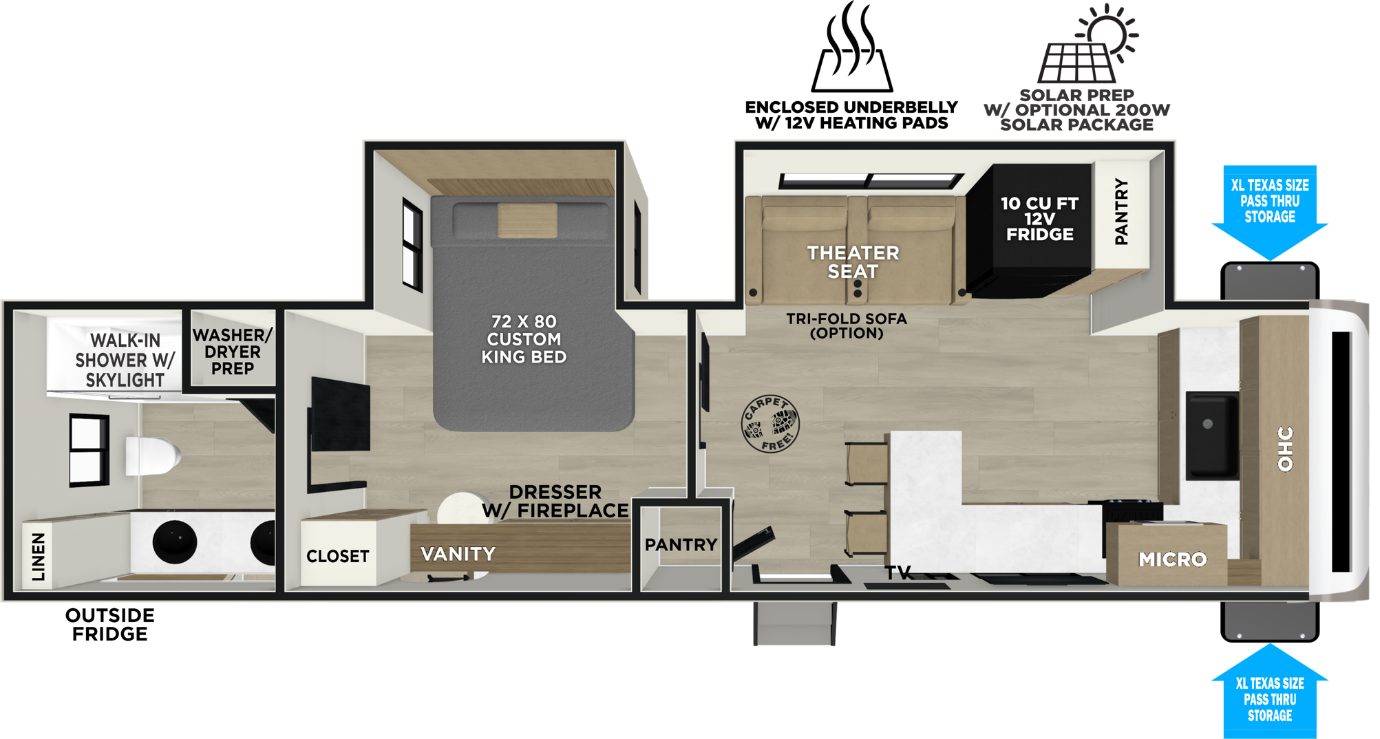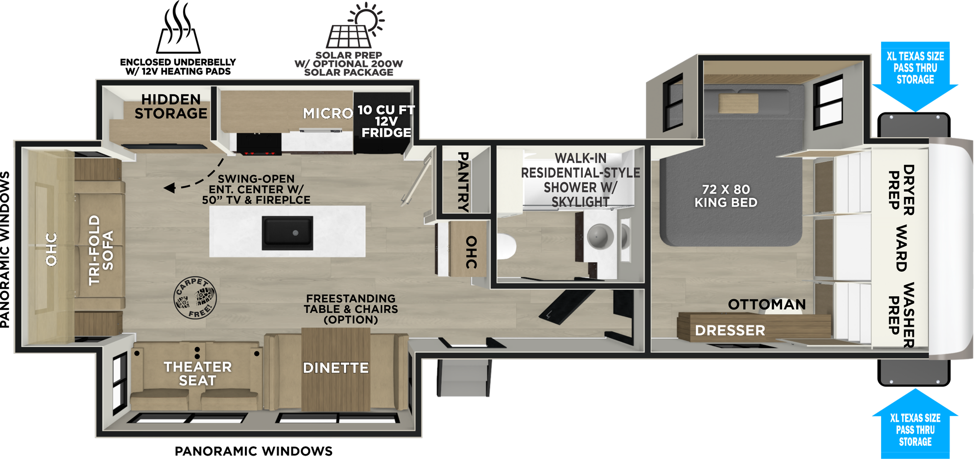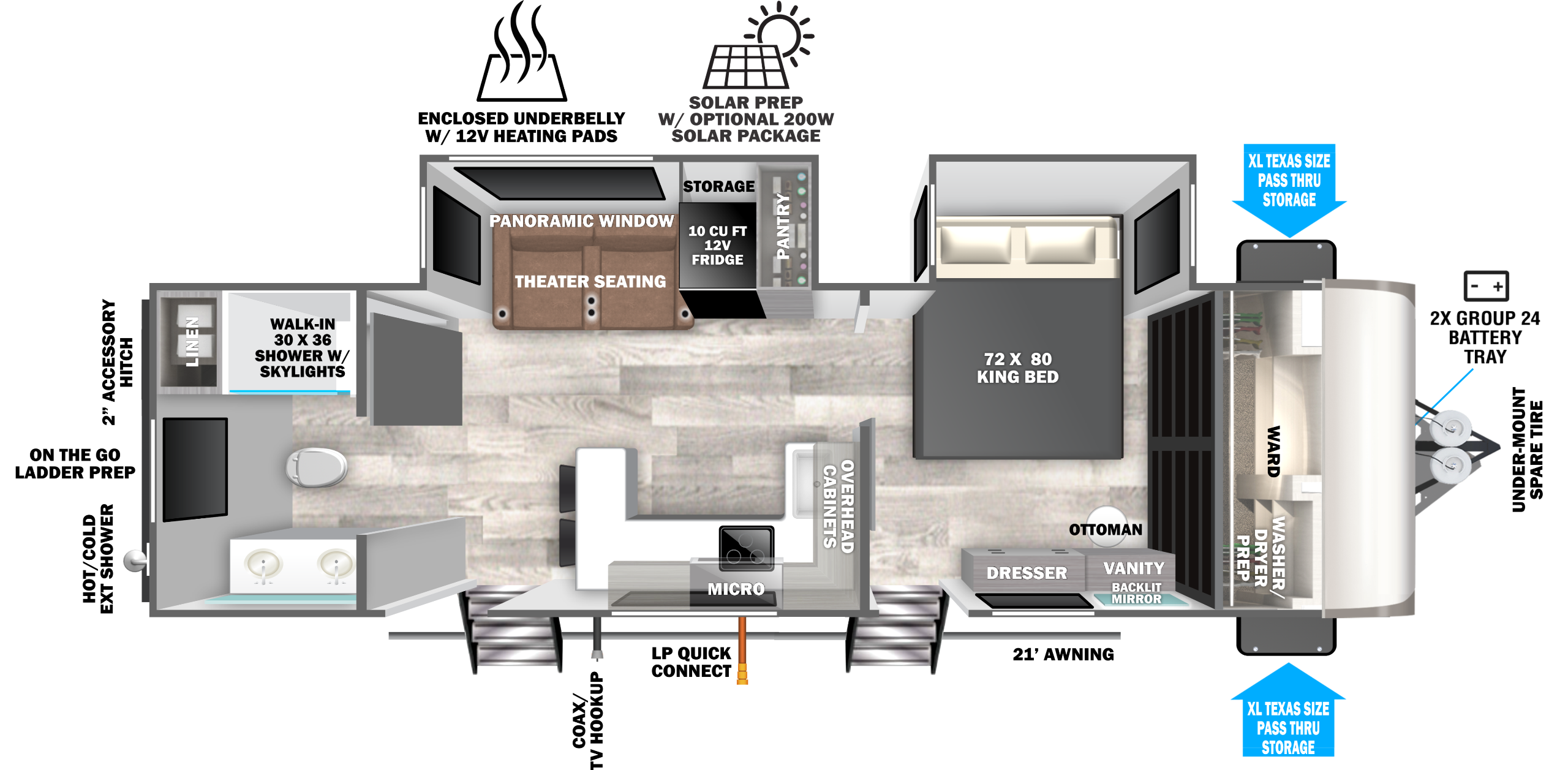 The 270FKS has a bedroom fit for a king... or fifth wheel. Enjoy a custom king bed slide, accompanied by a massive wardrobe and stackable washer/dryer prep. The elegance continues in the living area, which features a walk-in pantry and enough countertop space for a Superbowl party. Enjoy beautiful views out the front windshield while washing or prepping dishes. Outside, you'll find a standard griddle, fridge and spacious storage.