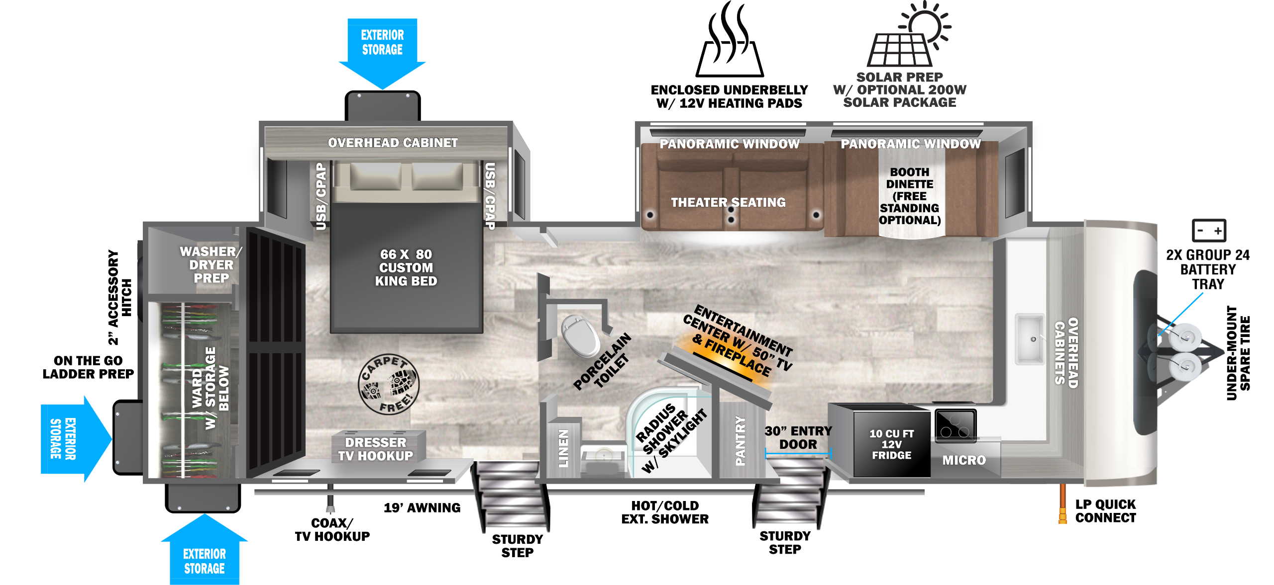 The 25BHHL packs the most punch of any double-over-double bunk model on the market. It features large windows facing both sides of the campsite, 2 entrances (including one into bathroom), and a properly equipped outside kitchen. A large pantry and a power bed are just a couple difference-maker features that this model sports.